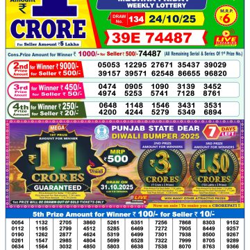 Nagaland State Lottery 1 PM Result Today 24.10.2025 LIVE: Dear Lottery Sambad Winner List