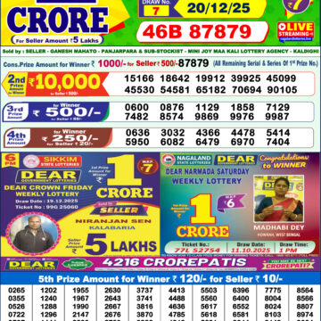 Nagaland State Lottery 1 PM Result Today 20.12.2025 LIVE: Dear Lottery Sambad Winner List