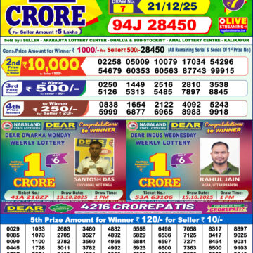 Nagaland State Lottery 1 PM Result Today 21.12.2025 LIVE: Dear Lottery Sambad Winner List
