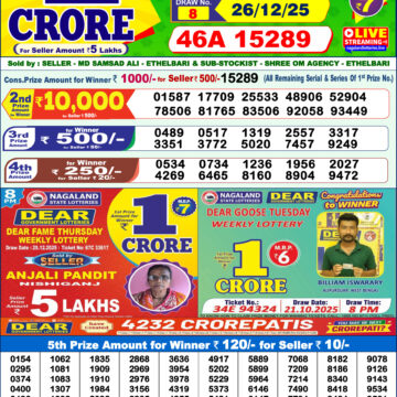 Nagaland State Lottery 1 PM Result Today 26.12.2025 LIVE: Dear Lottery Sambad Winner List