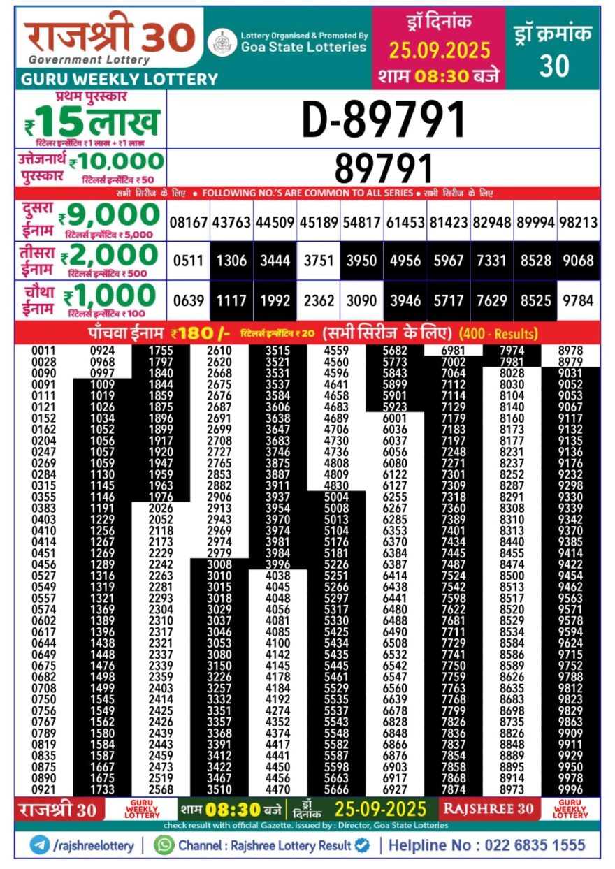 Goa Rajshree 30 Lottery Result 8:30 PM LIVE 25.09.2025: Check Today’s Winners