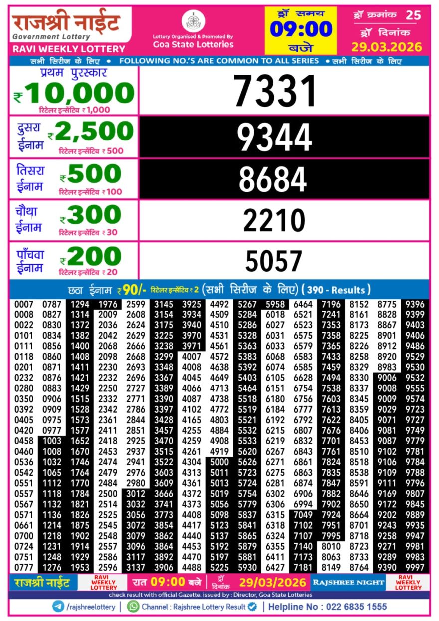 Goa Rajshree Night Lottery Result 9 PM LIVE 29.03.2026: Check Today’s Winners