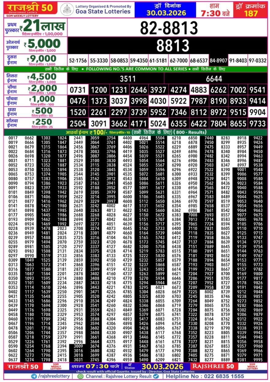 Goa State Lottery Rajshree 50 Result 7:30 PM Today 30.03.2026 LIVE March 30, 2026 Leave a Comment on Goa State Lottery Rajshree 50 Result 7:30 PM Today 30.03.2026 LIVE Posted in Results Share: XFacebookPinterestRedditVKDiggLinkedinMix