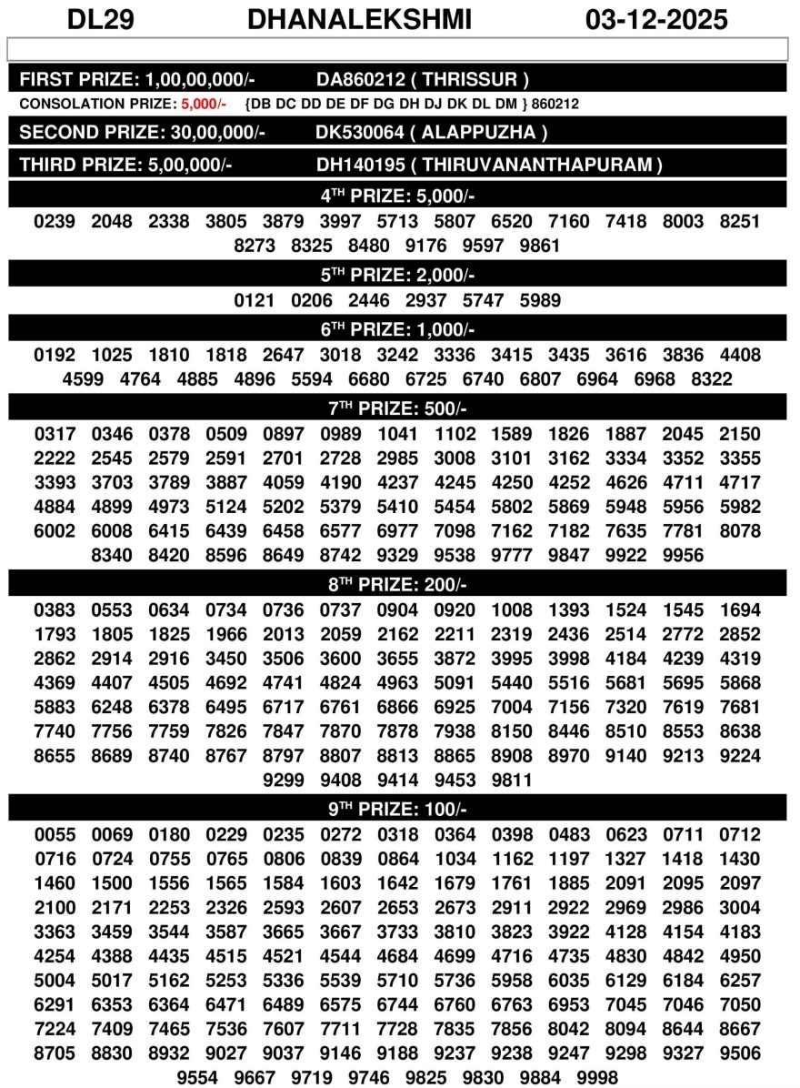 Kerala Lottery Result Dhanalekshmi DL 29 Today Result 03.12.2025 December 3, 2025 Leave a Comment on Kerala Lottery Result Dhanalekshmi DL 29 Today Result 03.12.2025 Posted in Kerala Lottery Result Dhanalakshmi Share: XFacebookPinterestRedditVKDiggLinkedinMix