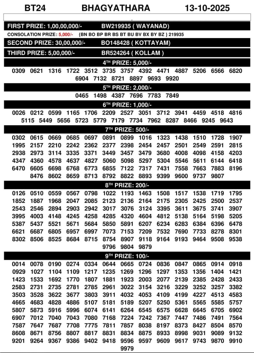 Kerala State BHAGYATHARA Result BT 24 Today 13.10.2025 October 13, 2025 Leave a Comment on Kerala State BHAGYATHARA Result BT 24 Today 13.10.2025 Posted in Kerala Lottery Result, Kerala Lottery Result Bhagyathara Share: XFacebookPinterestRedditVKDiggLinkedinMix