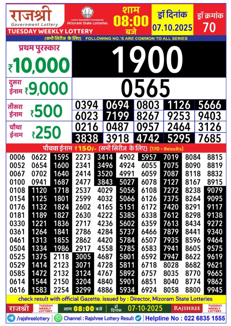LIVE: Mizoram Rajshree Daily 8 PM Lottery Result Today 07.10.2025 October 7, 2025 Leave a Comment on LIVE: Mizoram Rajshree Daily 8 PM Lottery Result Today 07.10.2025 Posted in Rajshree 8pm Result Share: XFacebookPinterestRedditVKDiggLinkedinMix