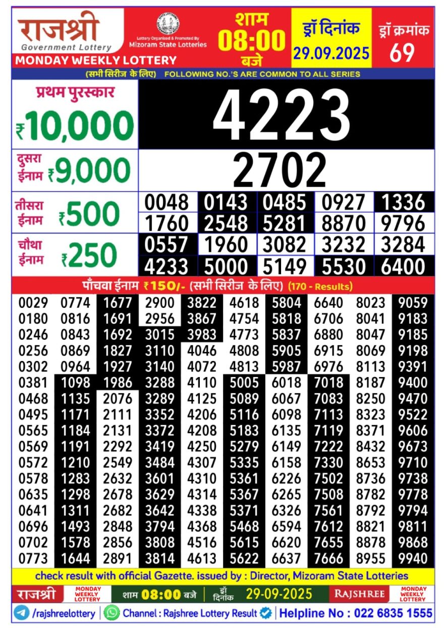 LIVE: Mizoram Rajshree Daily 8 PM Lottery Result Today 29.09.2025 September 29, 2025 Leave a Comment on LIVE: Mizoram Rajshree Daily 8 PM Lottery Result Today 29.09.2025 Posted in Rajshree 8pm Result Share: XFacebookPinterestRedditVKDiggLinkedinMix
