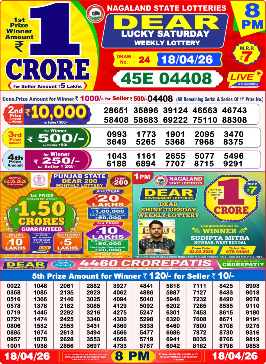 LIVE: Nagaland State Lottery Dear Daily 8 PM Result Today 18.04.2026 – Check Winning Numbers April 18, 2026 Leave a Comment on LIVE: Nagaland State Lottery Dear Daily 8 PM Result Today 18.04.2026 – Check Winning Numbers Posted in Results Share: XFacebookPinterestRedditVKDiggLinkedinMix