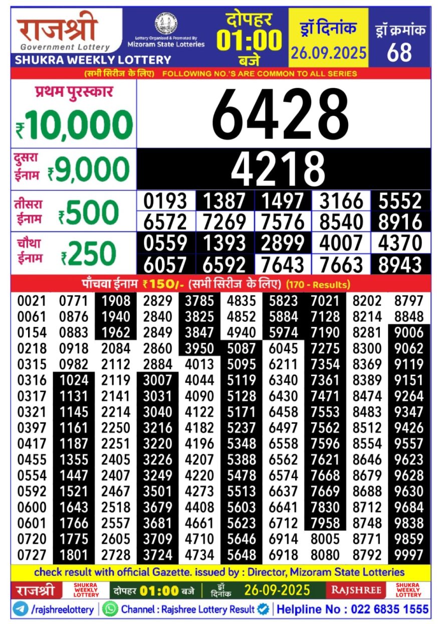 Mizoram Rajshree 1 PM Lottery Result Today 26.09.2025 LIVE Update
