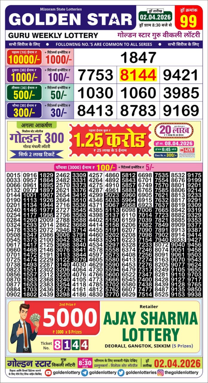 April 2, 2026  Leave a Comment on Mizoram State Lottery Golden 8:30 PM Result 02.04.2026 LIVE: Check Today’s Winning Numbers  Posted in Golden Star