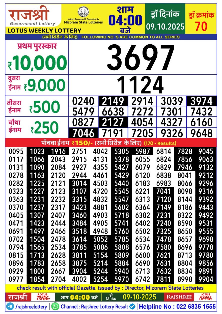 October 9, 2025  Leave a Comment on Mizoram State Lottery Rajshree 4 PM Result 09.10.2025: Today’s LIVE Winners  Posted in Rajshree 4pm result