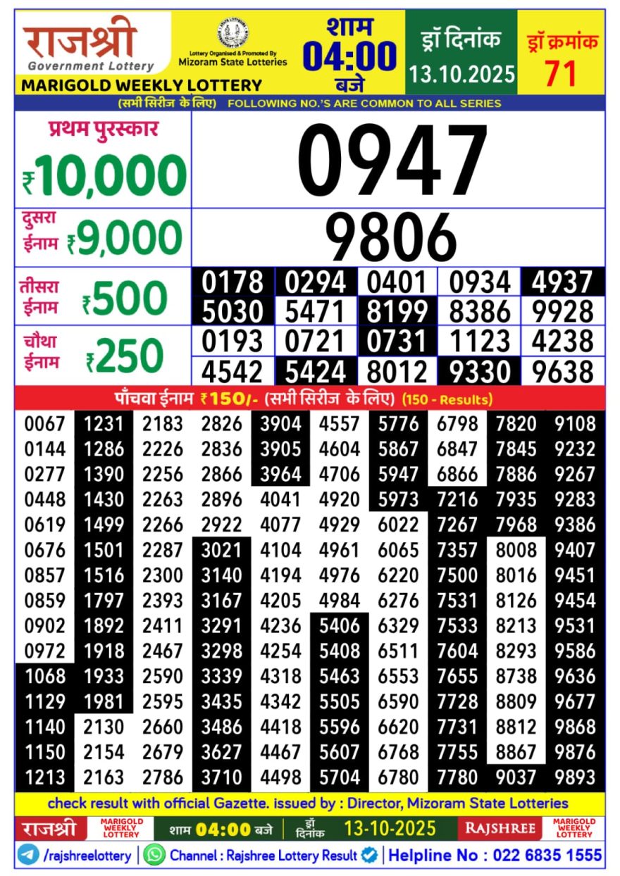 Mizoram State Lottery Rajshree 4 PM Result 13.10.2025: Today’s LIVE Winners October 13, 2025 Leave a Comment on Mizoram State Lottery Rajshree 4 PM Result 13.10.2025: Today’s LIVE Winners Posted in Rajshree 4pm result Share: XFacebookPinterestRedditVKDiggLinkedinMix