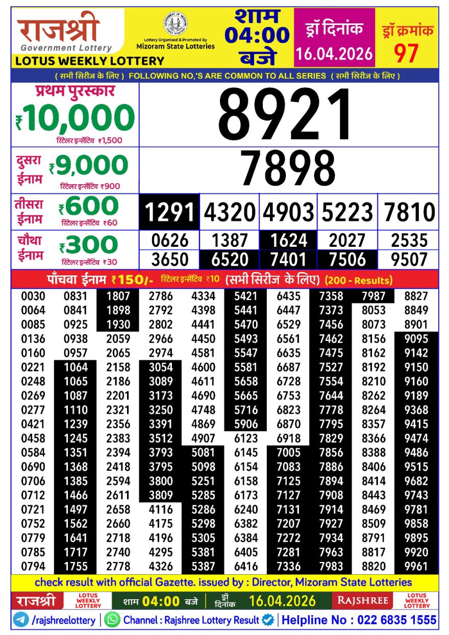 Mizoram State Lottery Rajshree 4 PM Result 16.04.2026: Today’s LIVE Winners April 15, 2026 Leave a Comment on Mizoram State Lottery Rajshree 4 PM Result 16.04.2026: Today’s LIVE Winners Posted in Results Share: XFacebookPinterestRedditVKDiggLinkedinMix