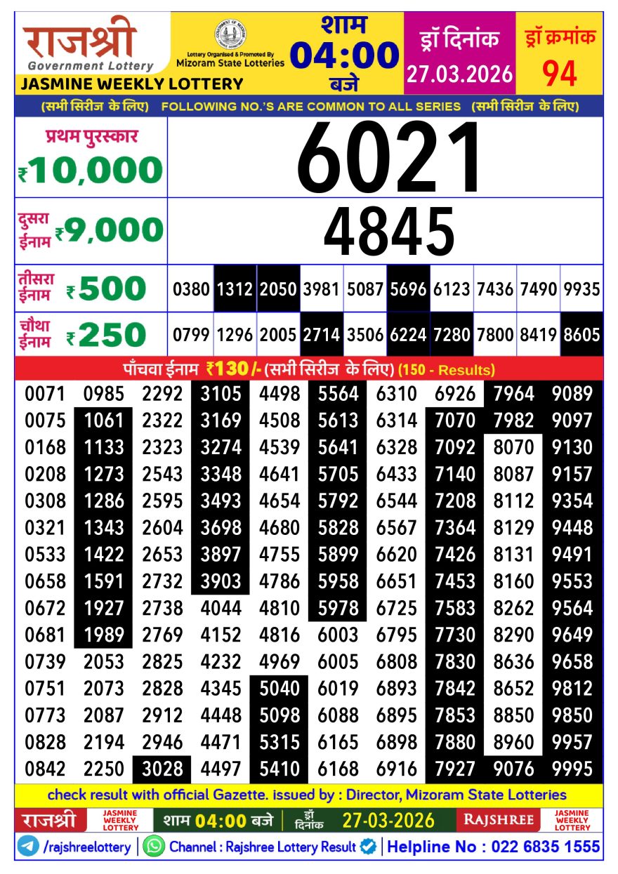Mizoram State Lottery Rajshree 4 PM Result 27.03.2026: Today’s LIVE Winners March 27, 2026 Leave a Comment on Mizoram State Lottery Rajshree 4 PM Result 27.03.2026: Today’s LIVE Winners Posted in Results Share: XFacebookPinterestRedditVKDiggLinkedinMix