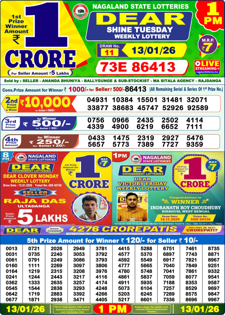 Nagaland State Lottery 1 PM Result Today 13.01.2026 LIVE: Dear Lottery Sambad Winner List