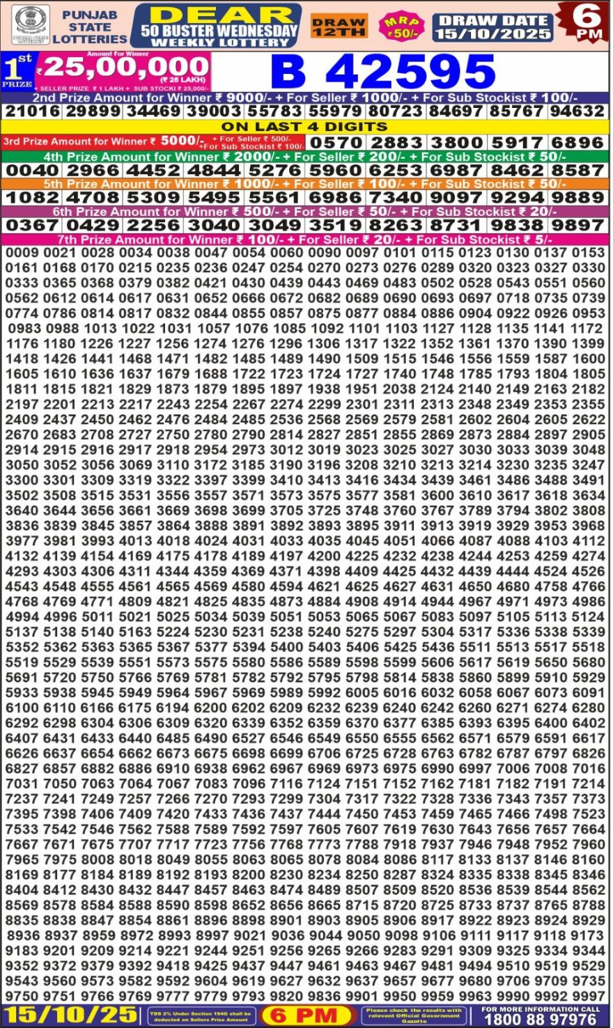 Punjab State Lottery Dear 50 Daily 6 PM Result Today 15.10.2025 LIVE October 15, 2025 Leave a Comment on Punjab State Lottery Dear 50 Daily 6 PM Result Today 15.10.2025 LIVE Posted in Punjab state dear10 6pm lottery result Share: XFacebookPinterestRedditVKDiggLinkedinMix