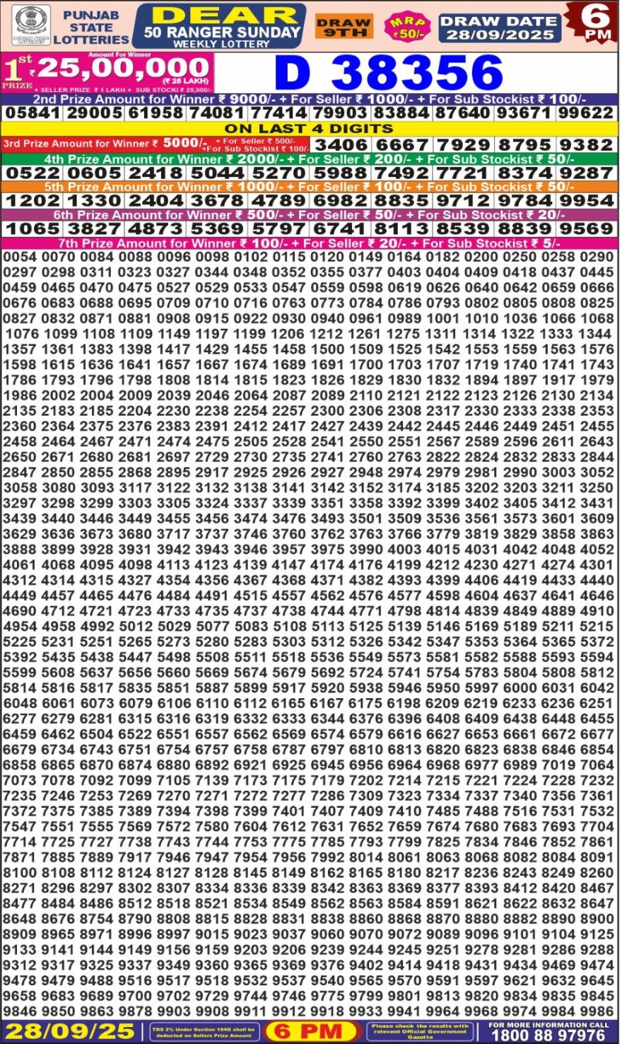 Punjab State Lottery Dear 50 Daily 6 PM Result Today 28.09.2025 LIVE September 28, 2025 Leave a Comment on Punjab State Lottery Dear 50 Daily 6 PM Result Today 28.09.2025 LIVE Posted in Punjab state dear10 6pm lottery result Share: XFacebookPinterestRedditVKDiggLinkedinMix