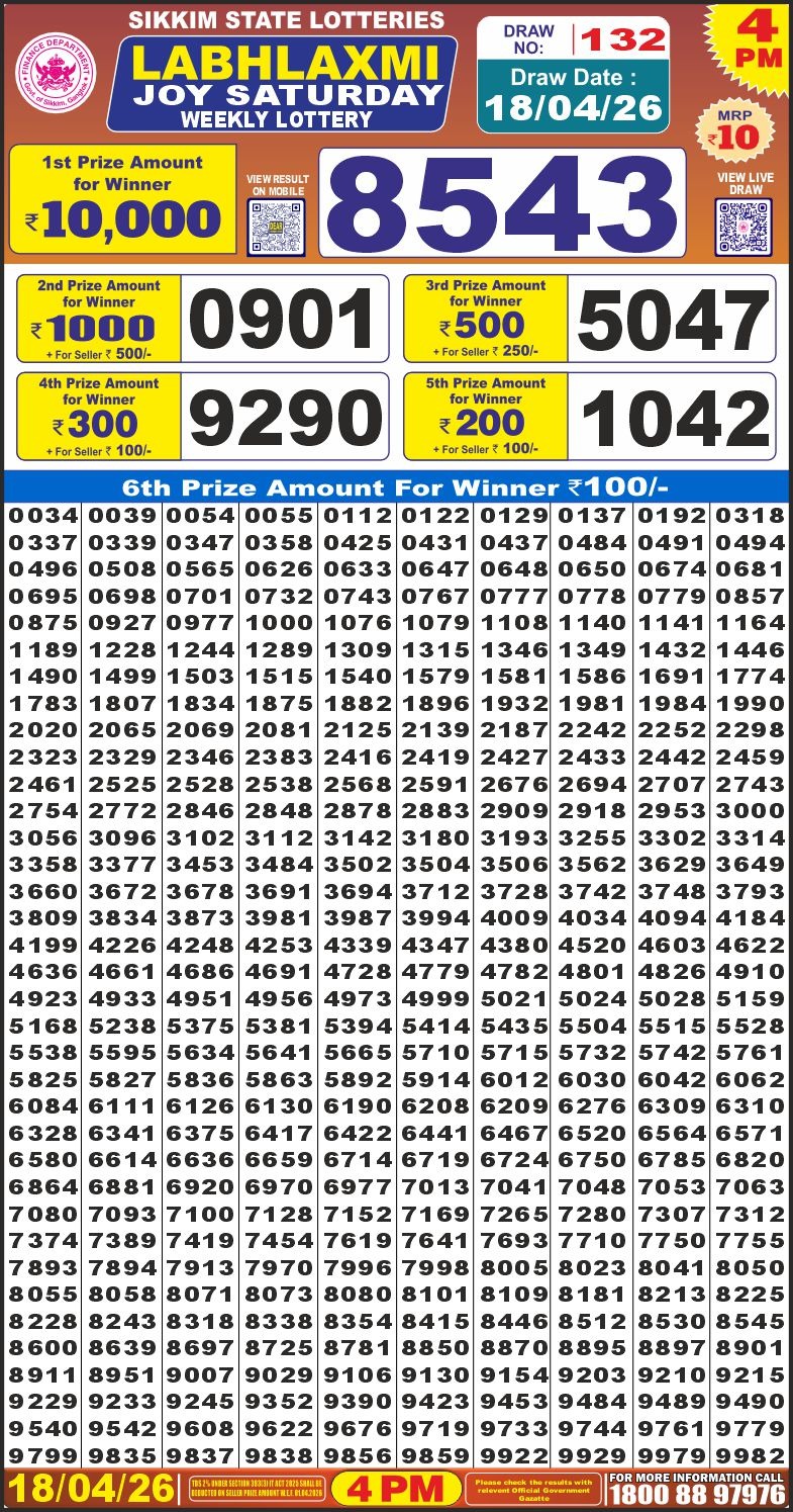 Sikkim Labh Laxmi 4 PM Lottery Result 18.04.2026: Today’s LIVE Draw April 18, 2026 Leave a Comment on Sikkim Labh Laxmi 4 PM Lottery Result 18.04.2026: Today’s LIVE Draw Posted in Results Share: XFacebookPinterestRedditVKDiggLinkedinMix