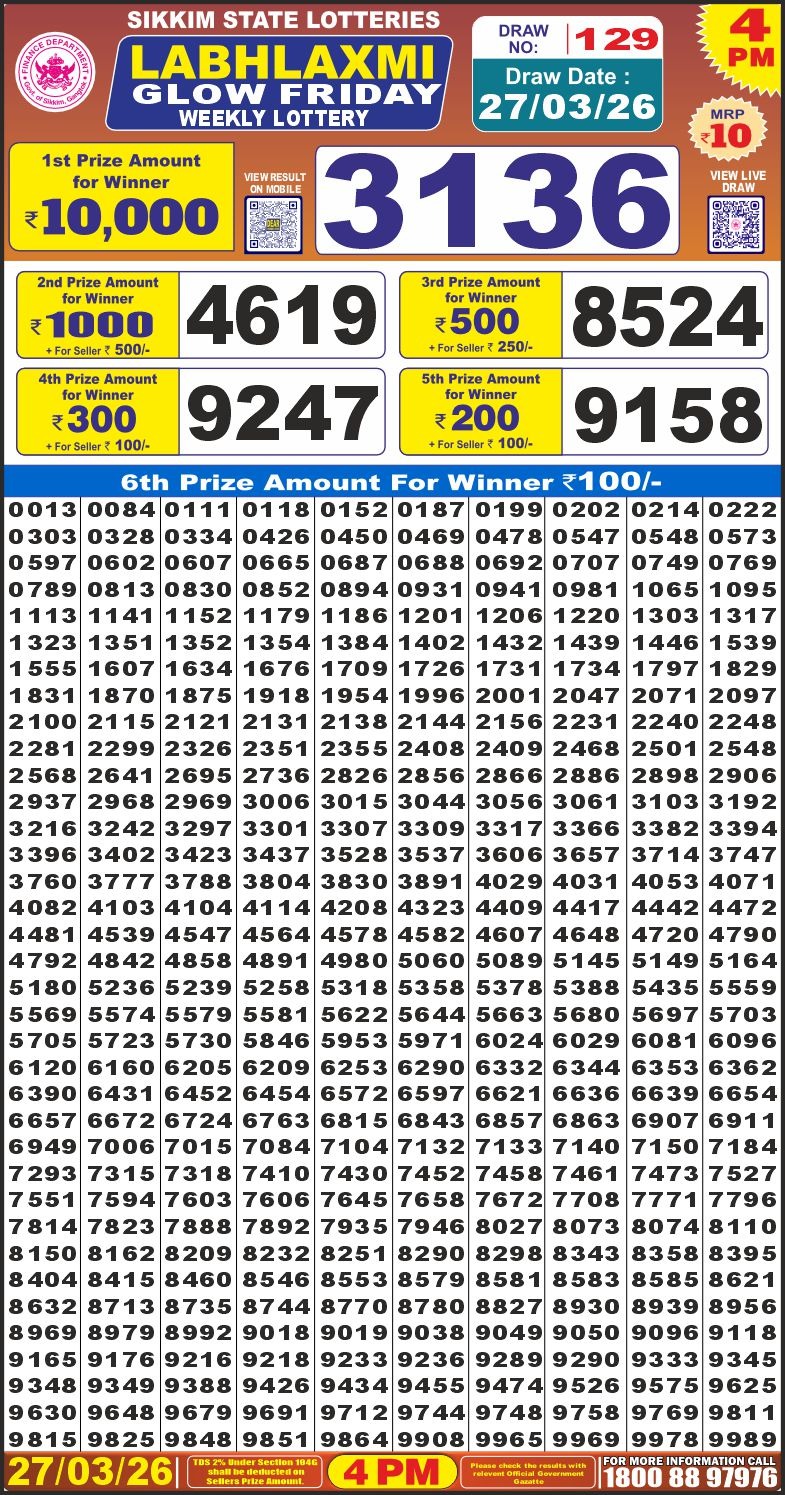 Sikkim Labh Laxmi 4 PM Lottery Result 27.03.2026: Today’s LIVE Draw March 27, 2026 Leave a Comment on Sikkim Labh Laxmi 4 PM Lottery Result 27.03.2026: Today’s LIVE Draw Posted in Results Share: XFacebookPinterestRedditVKDiggLinkedinMix